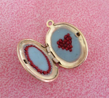 After a few experiments outside of the locket it was obvious that the area for decoration was so small that using size 15 seed beads it would be hard to be too intricate. So instead I decided that I would simply use a basic motif which is easily understood and would be seen from afar- a heart.