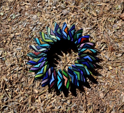 It's my Caldera bangle in blues and greens (as in the kit) very kindly beaded by Jo Prowse. So if you were tempted by the kit now you can see exactly what it looks like- but be quick as I only have 1 left...if you want it in pinks and lilacs then I have a couple more of those still available and also a few in black and white...