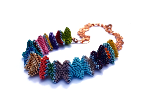 This is the first time I've used size 8 seed beads for a full triangle project and I love the way the colours combine with the copper chain. I'm also pleased that I worked out a way to turn the necklace into a bracelet at the click of a clasp.