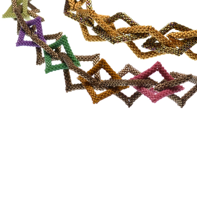 This is an intermediate class suitable for anyone comfortable with peyote & brick stitch and covers the basic method of construction as well as how it can be varied to adjust the geometric shape beaded, and the size and lines of that shape.