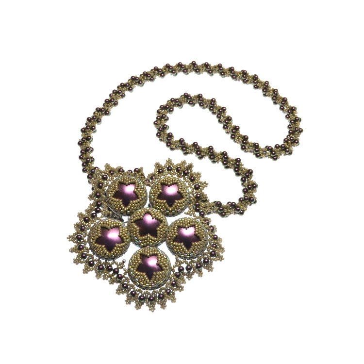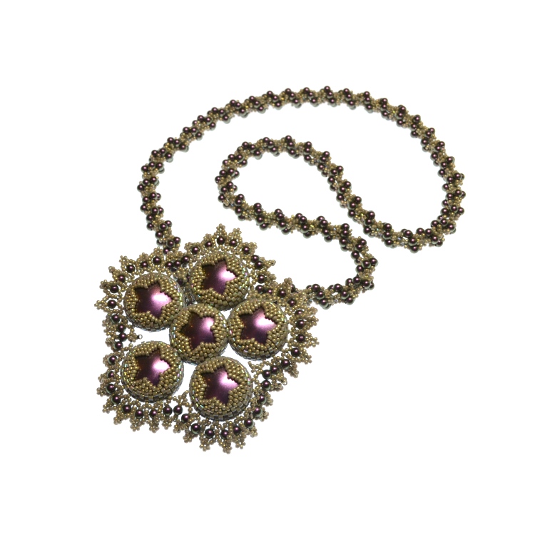 This stunning necklace, Peacock Lace, is formed of a pendant, which uses the large pearls bezelled and then adorned with a star design before a pearl based lace embellishment is added. Lastly a matching pearl and seed bead rope is made, from which the pendant can hang.