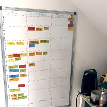 Then someone introduced me to Kanban boards (splitting your work into 'to-do', 'doing' and 'done') and I've used this for a while but found my post-it notes weren't working any more so treated myself to a magnetic board and lots of colourful magnets so that whenever I make a cup of tea I can check-out what tasks I need to be getting on with.
