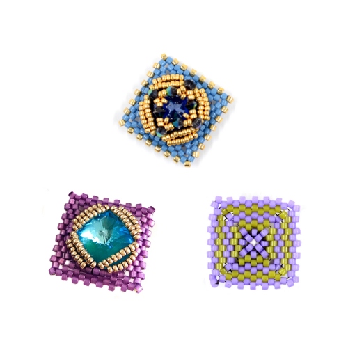 Clockwise from the top here is an 'Ornate' Square, a 'Plain' Square, and a 'Sparkly' Square and you get to choose which one you make depending on your taste, bead stash, and time commitment...