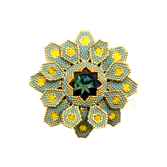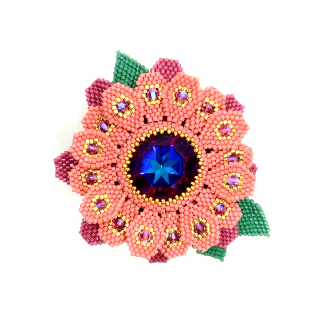 This advanced class combines unique geometric beadwork (Brick & Peyote Stitch), crystals and floral motifs to make striking pendants/brooches with their own beaded stand.