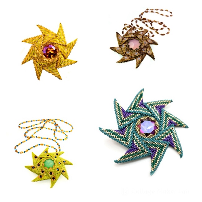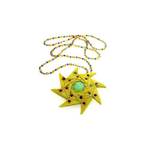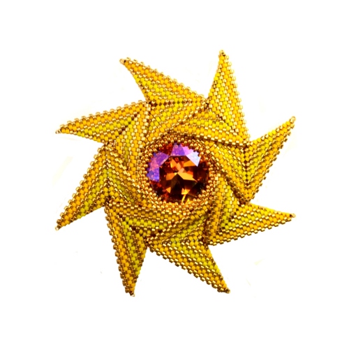 This Zoom beading class is to make a striking and unique pendant/ brooch which combines geometric beadwork with crystals for a real wow factor! The pendant (which is approximately 3 ½ inches/ 9cm across) is strung on an optional beaded chain designed to let the pendant stand out in all its glory.